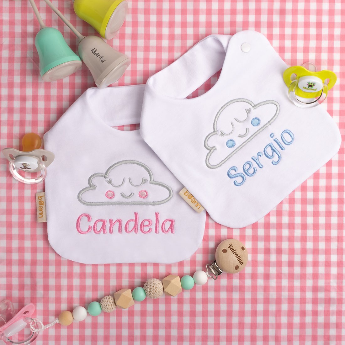 Babero diseño de Nube con Colorete, el babero es color blanco con posibilidad de elegir el color del bordado del texto que quiere personalizar.