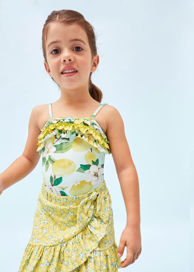 Bañador de tirantes para niña. Tejido fluido para una máxima comodidad en el día a día. Elementos de adorno: volante decorativo.