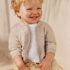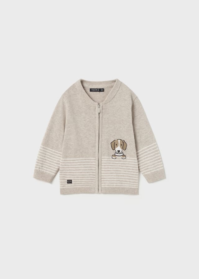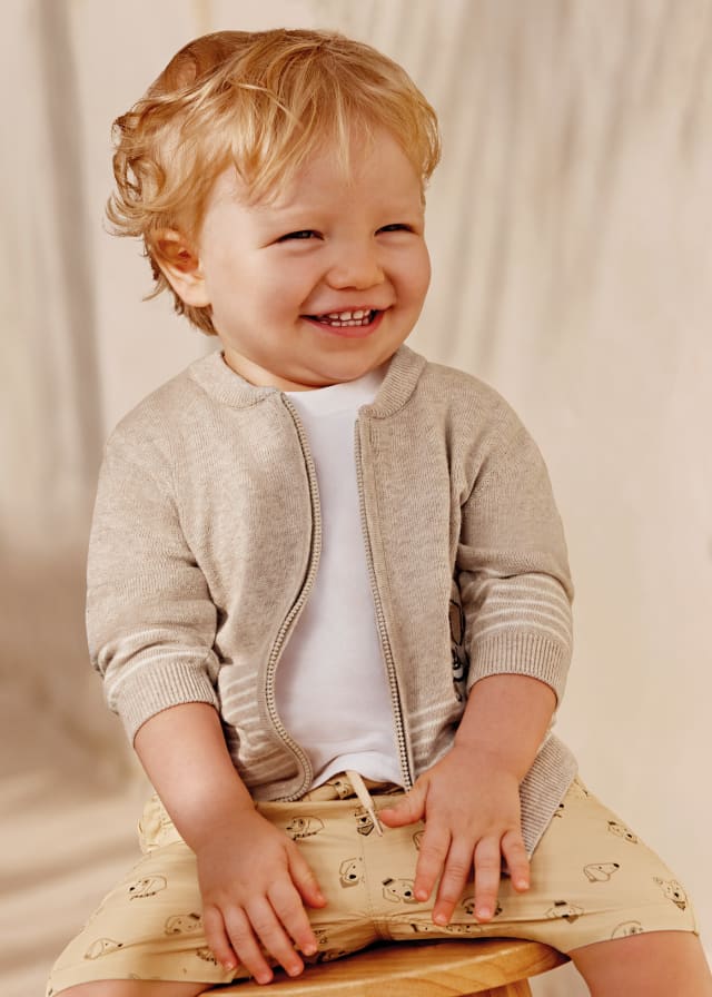 Prenda ECOFRIEND 100% algodón sostenible. Chaqueta tejida de manga larga para bebé. Cuello bomber. Cierre central delantero con cremallera.