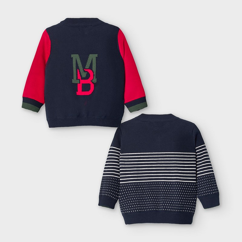 Chaqueta tejida de manga larga para bebé niño de 12 a 36 meses. Cuello semicisne. Cierre con cremallera. Tejido de punto tricotosa fino de tacto suave y agradable. Este modelo presenta un diseño reversible.