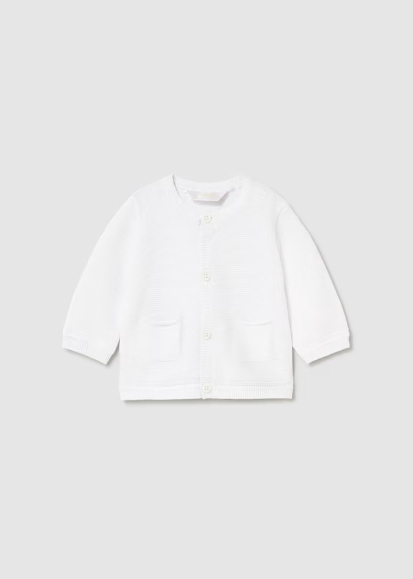 Cárdigan de manga larga para recién nacido. Cuello redondo. Cierre con botones en la parte delantera. Tejido de punto tricotosa de tacto suave y agradable. Bolsillos funcionales en la parte delantera. Elementos de adorno: detalle decorativo. Entre 0-18 meses.