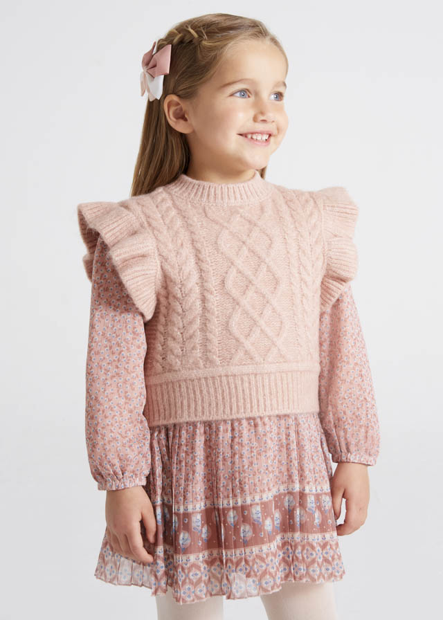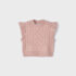 Chaleco sin mangas para niña. Cuello redondo. Elementos de adorno: volantes decorativos. Diseño exterior con efecto trenzado.
