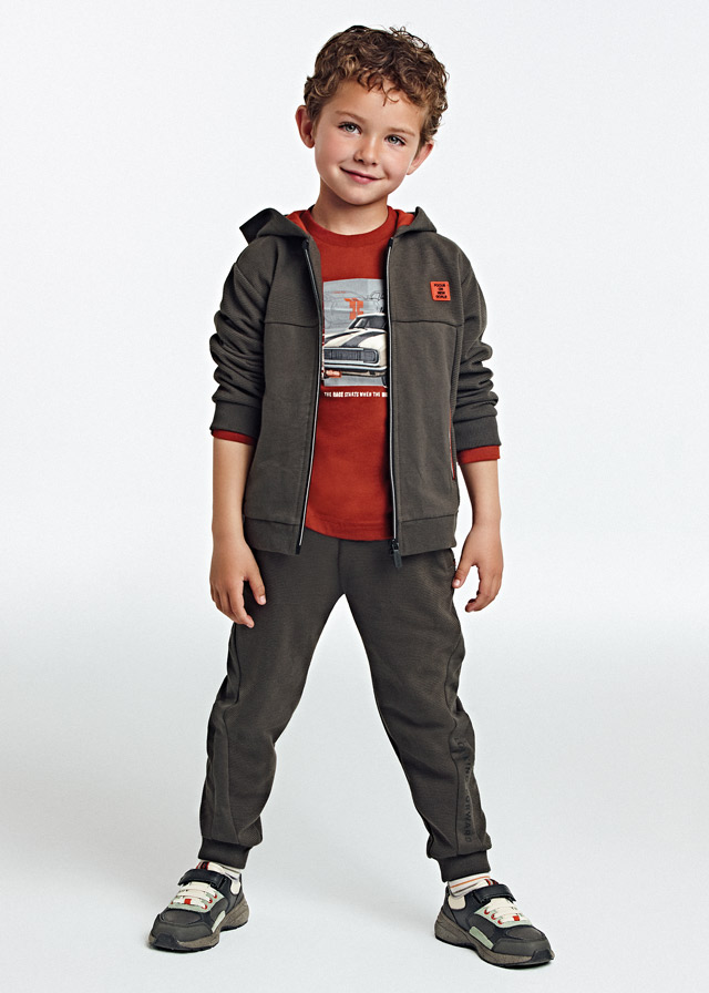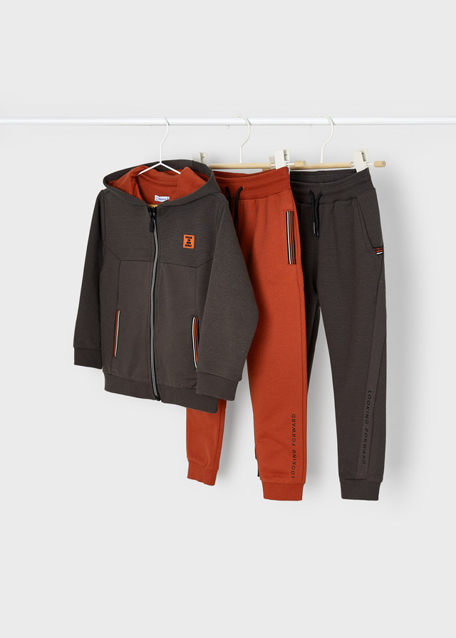 Chándal de tres piezas para niño compuesto por una sudadera y dos pantalones largos deportivos.