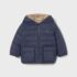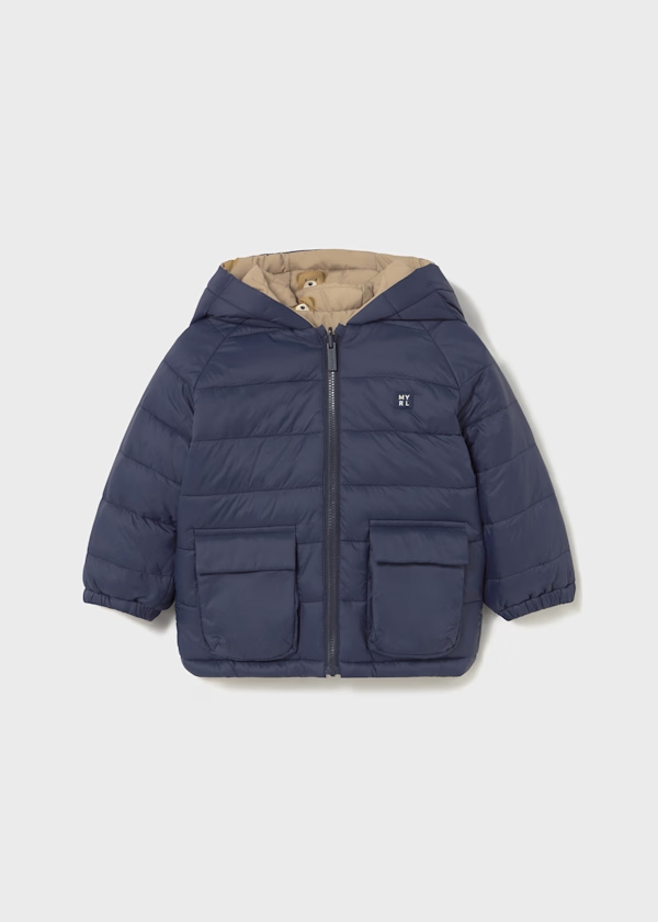 Relleno de la prenda 100% poliéster reciclado. Chaquetón de manga larga para bebé. Cuello con capucha. Cierre central delantero con cremallera. Exterior textil con efecto acolchado. Suave forro interior de poliéster. Puños y cuello de punto elástico para un mejor ajuste. Este modelo presenta un diseño reversible. Entre 12 meses y 4 años.