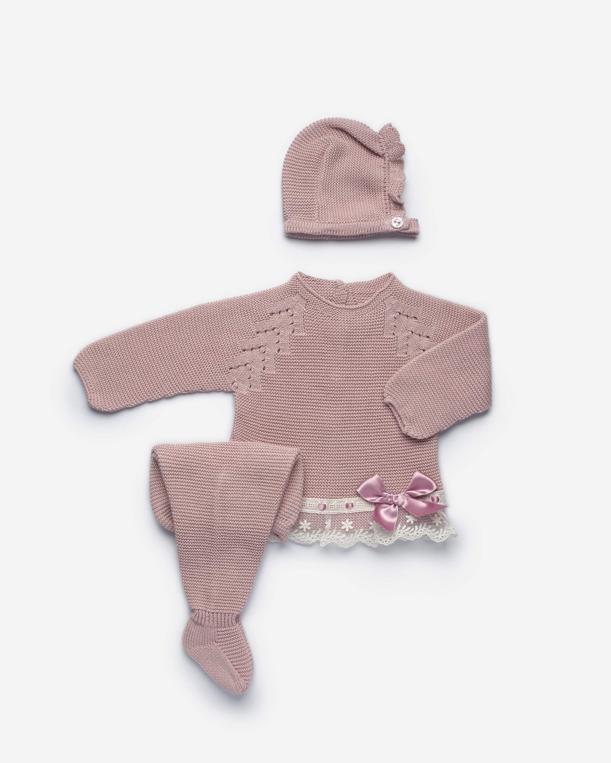 Conjunto 3 piezas en punto con jerseys m/l calado y adorno de tira encaje y lazo , polaina y gorro.