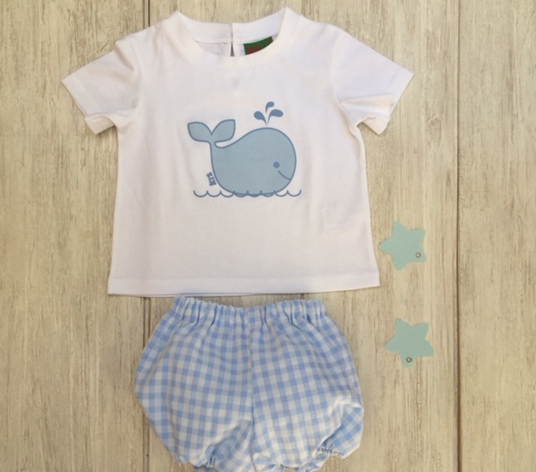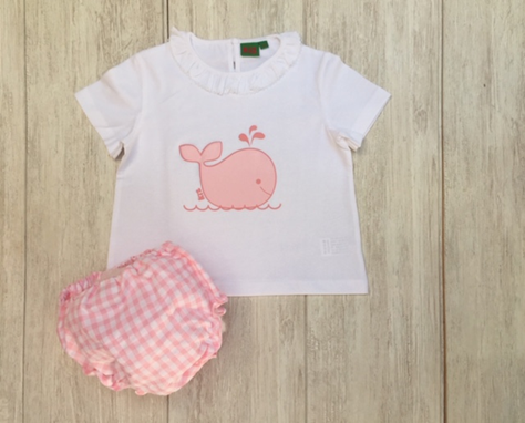Conjunto de camiseta estampado ballena y cubrepañal en colores celeste y rosa.