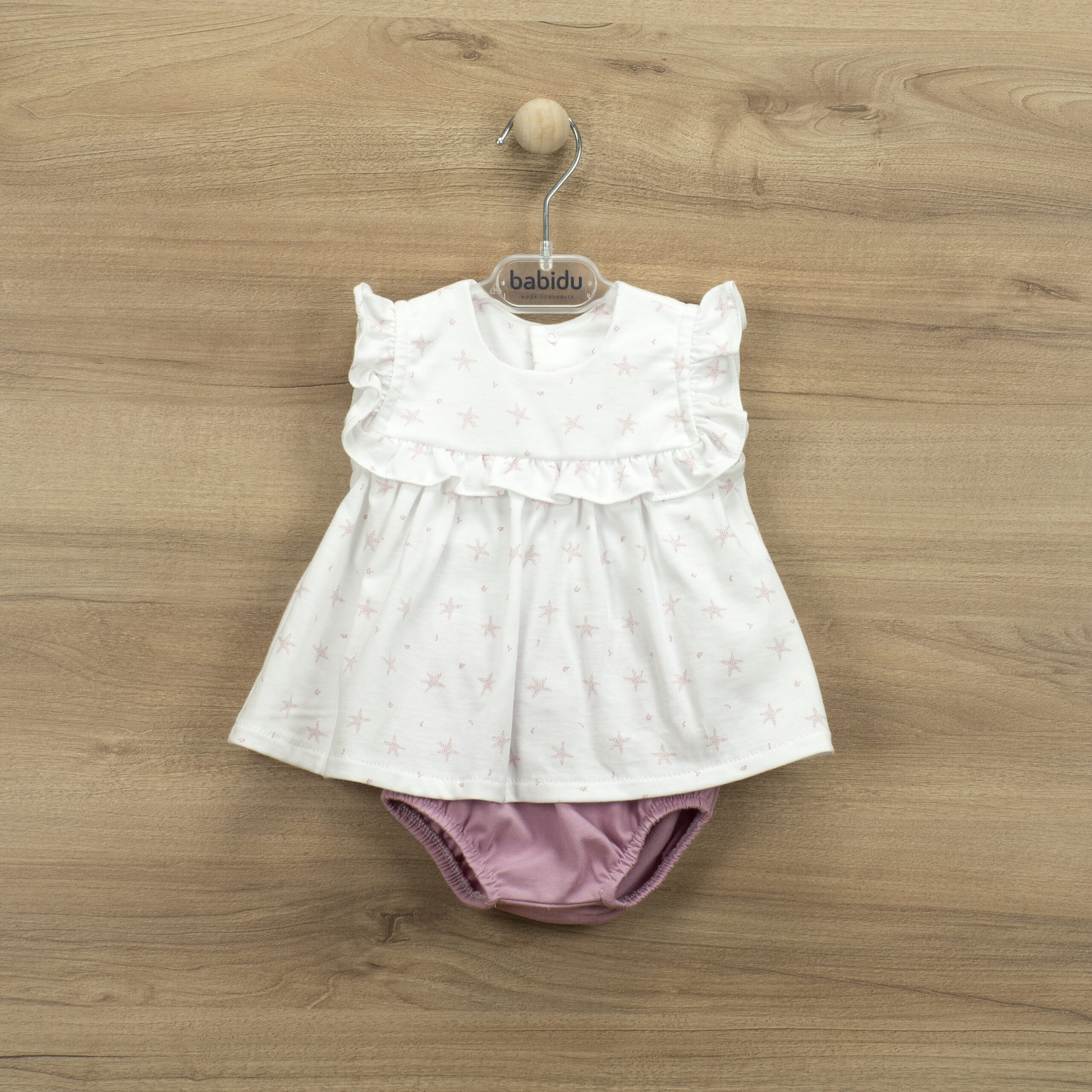 Conjunto jesusito con braguita y parte superior con volante de adorno.