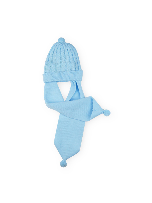 Gorro y bufanda a juego con pequeños pompones en los extremos. Este producto está disponible en talla única.