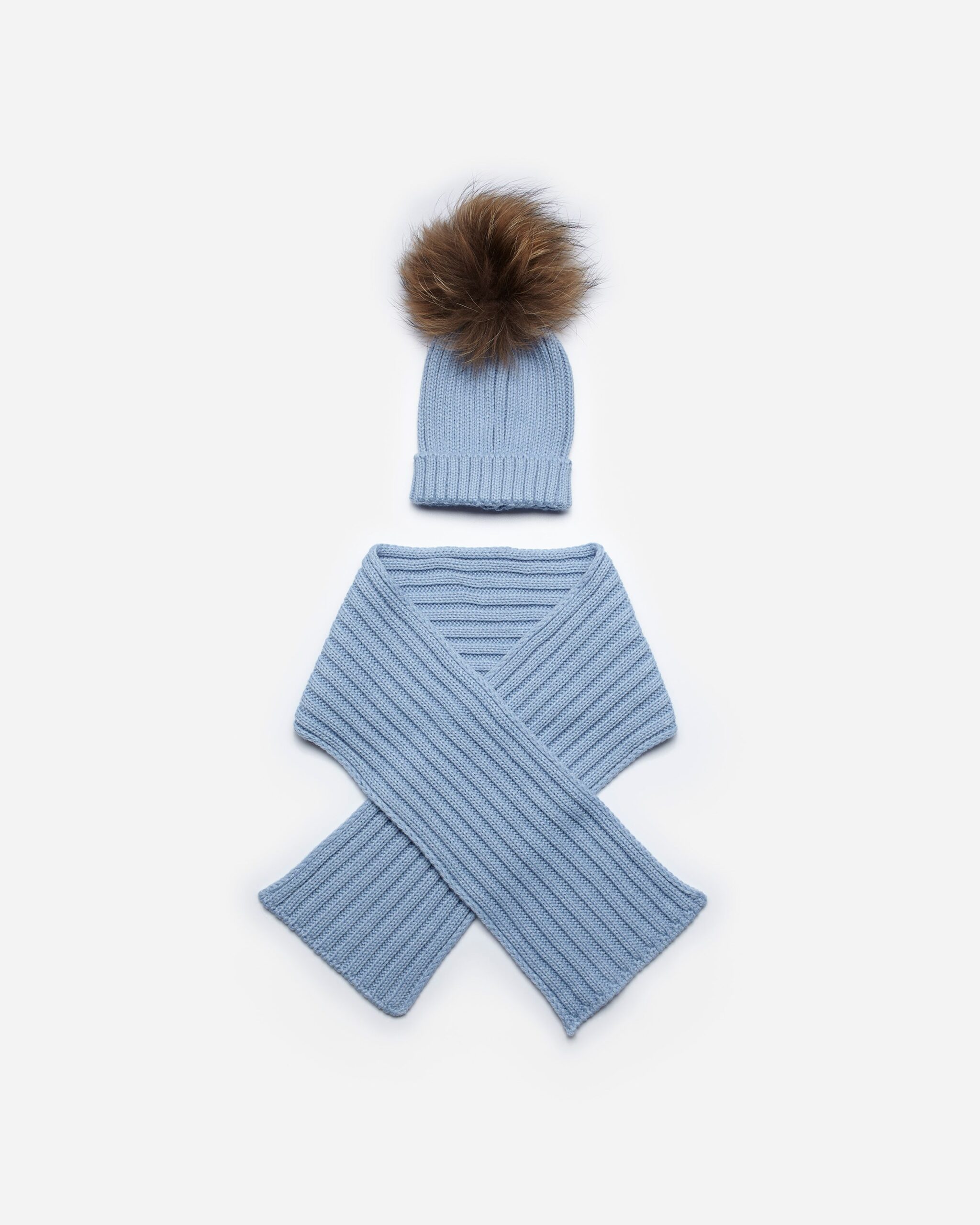 Gorro pompón+bufanda canalé en colores cielo, maquillaje, perla, rojo y verde agua.