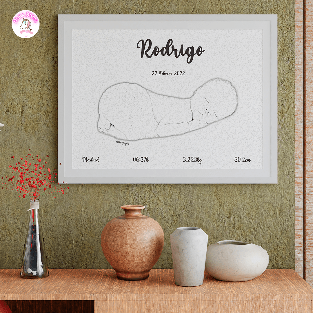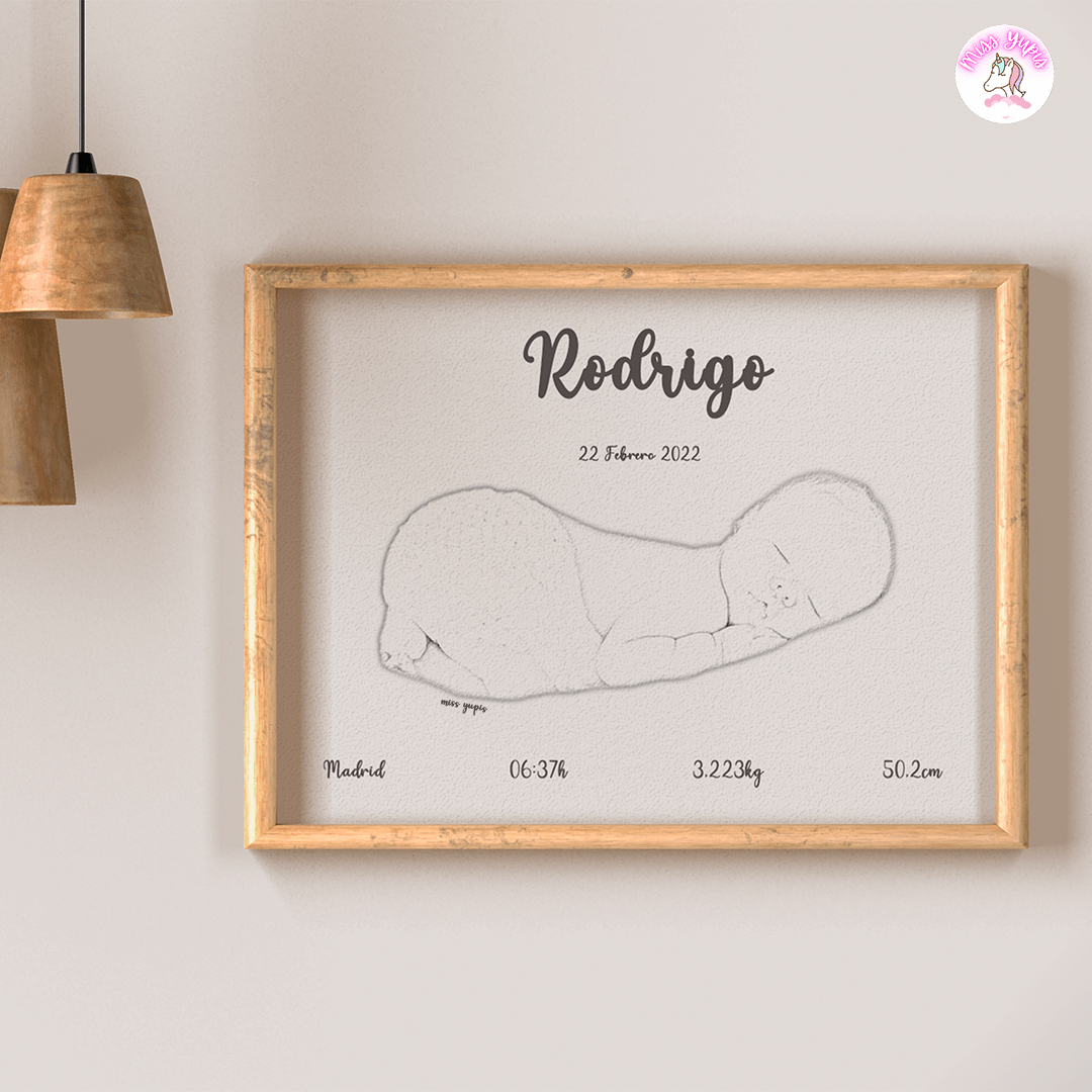 Lámina de nacimiento o natalicio personalizada a partir de una fotografía. Lámina perfecta para enmarcar y regalar y tener un recuerdo bonito para siempre, con los datos más importantes del nacimiento del bebé.