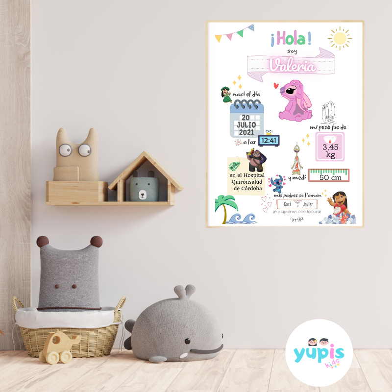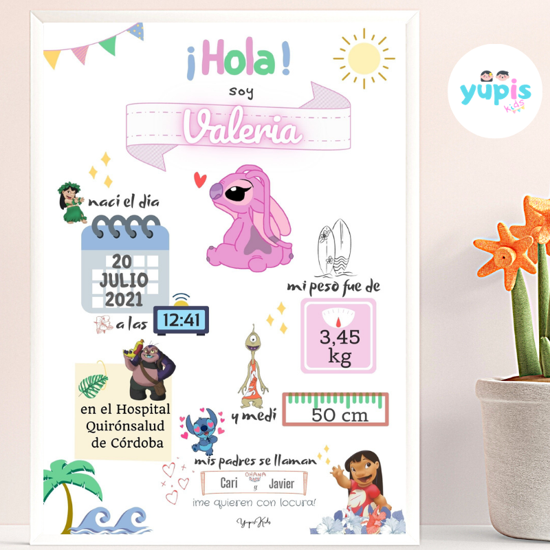 - Nombre y apellidos (opcional) del bebé. Es posible personalizar la lámina con el nombre o bien con el nombre y apellidos.