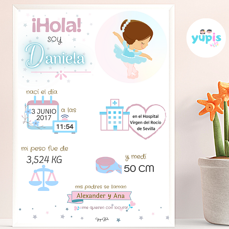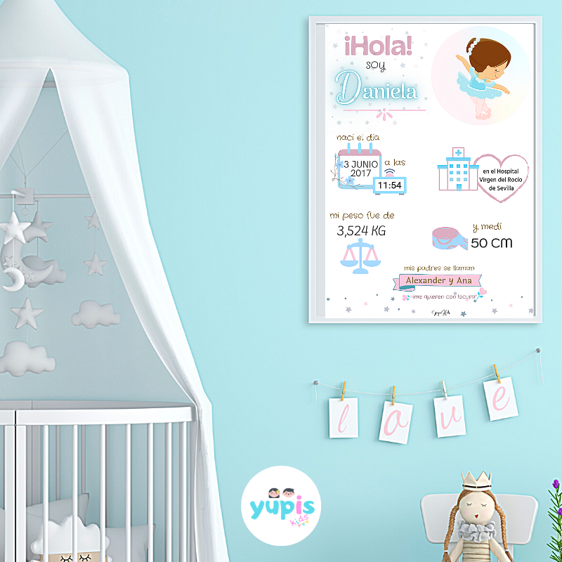 - Nombre y apellidos (opcional) del bebé. Es posible personalizar la lámina con el nombre o bien con el nombre y apellidos.