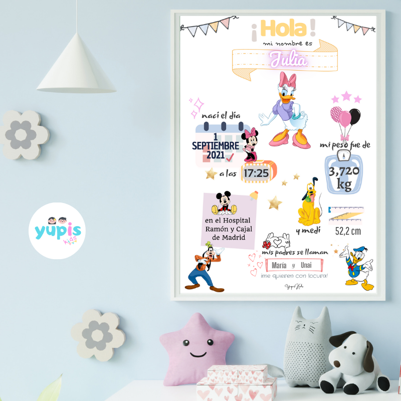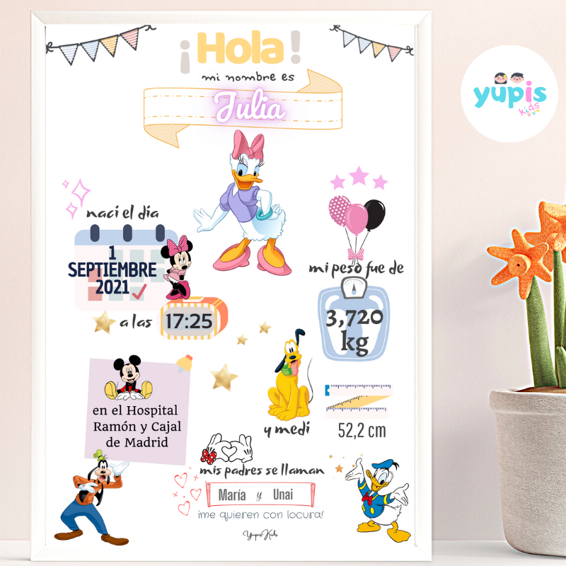 Lámina de nacimiento o natalicio con ilustración de Daisy. Lámina perfecta para enmarcar y regalar y tener un recuerdo bonito para siempre, con los datos más importantes del nacimiento del bebé.