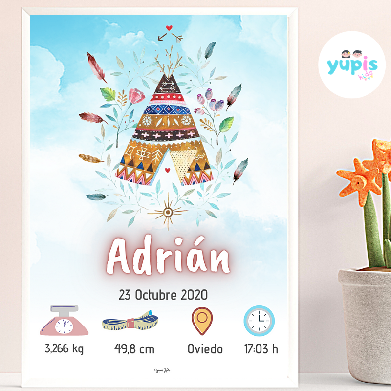 Lámina de nacimiento o natalicio con ilustración de un tipi. Lámina perfecta para enmarcar y regalar y tener un recuerdo bonito para siempre, con los datos más importantes del nacimiento del bebé.