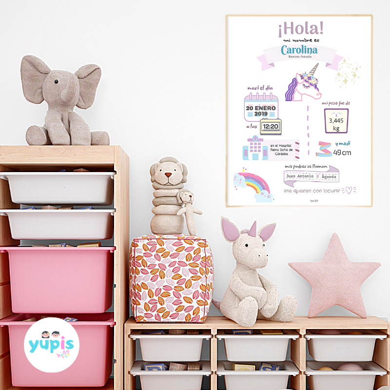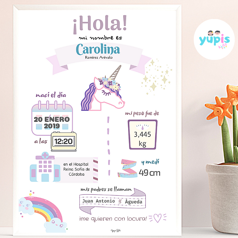 Lámina de nacimiento o natalicio con ilustración de un unicornio. Lámina perfecta para enmarcar y regalar y tener un recuerdo bonito para siempre, con los datos más importantes del nacimiento del bebé.