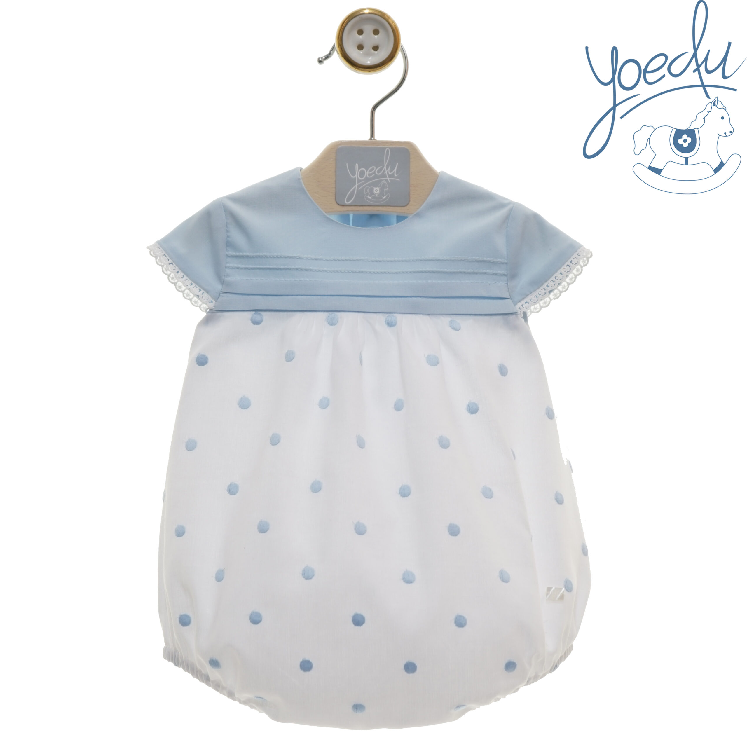 Pelele bombacho bebé trapense con lunares celestes.