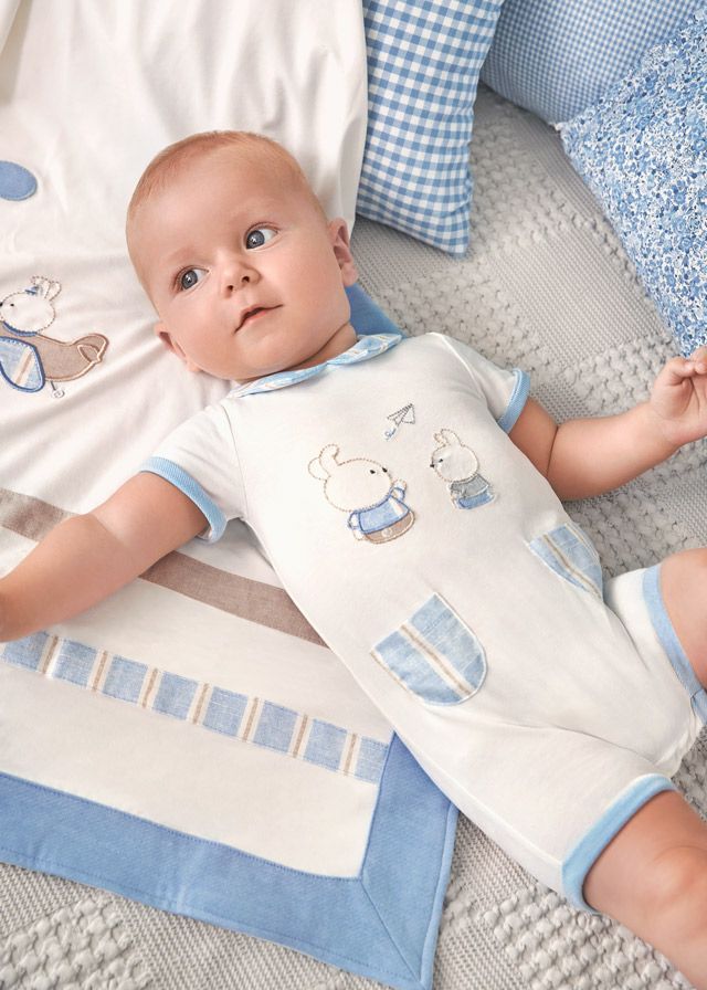 Prenda 100% algodón orgánico. Pelele de manga corta en tejido a contraste para recién nacido niño. Cuello de polo con detalles en distinto color.