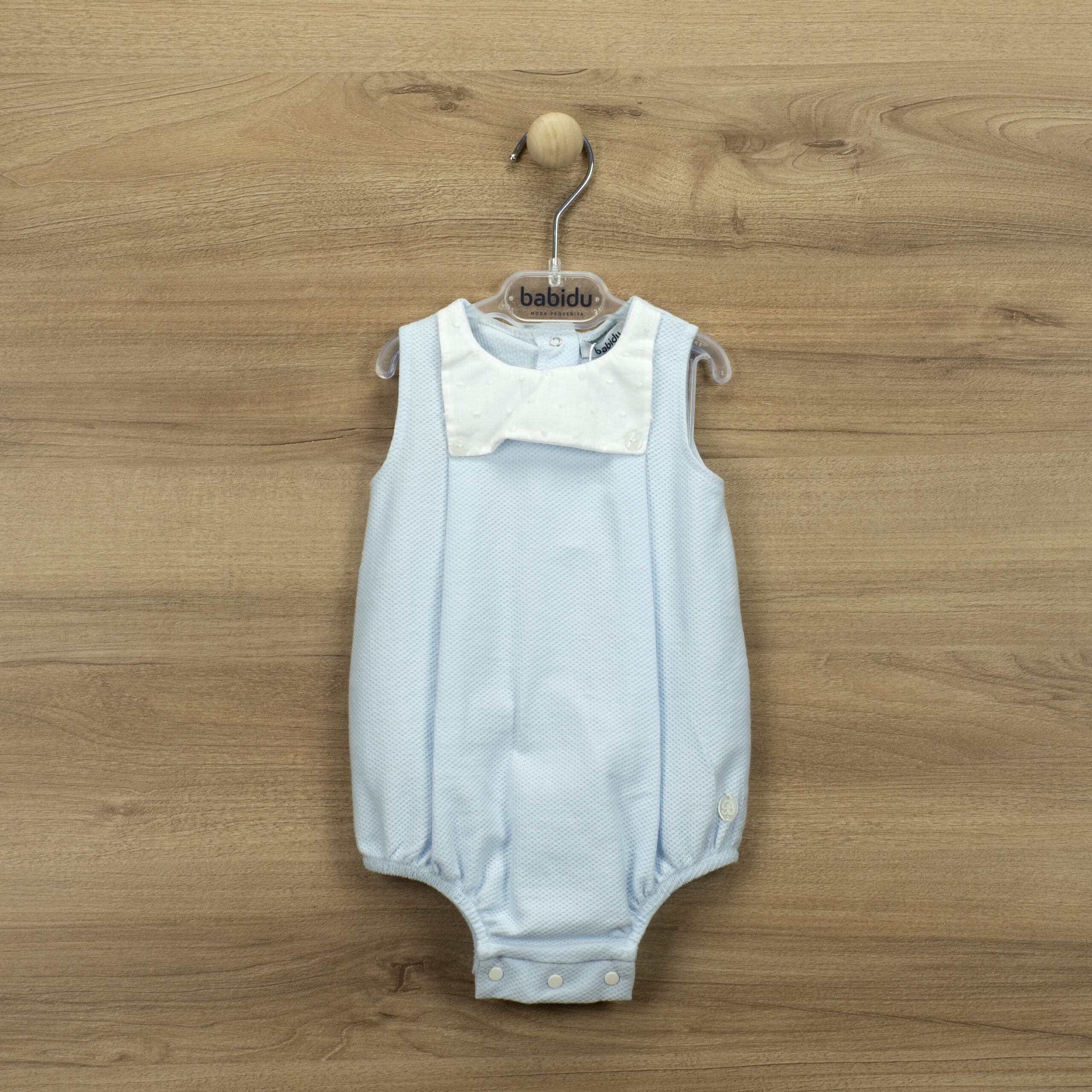 Pelele sin mangas en color celeste y parte superior en plumeti blanco.