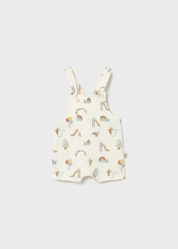 Peto corto de tirantes para recién nacido. Cuello recto. Cierre con botones en los tirantes y botones a presión en la entrepierna para facilitar la puesta. Tejido de algodón con lino de tacto suave y agradable. Cintura elástica para un mejor ajuste. Diseño cómodo que favorece la libertad de movimiento. Elementos de adorno: estampado decorativo. Entre 0-18 meses.
