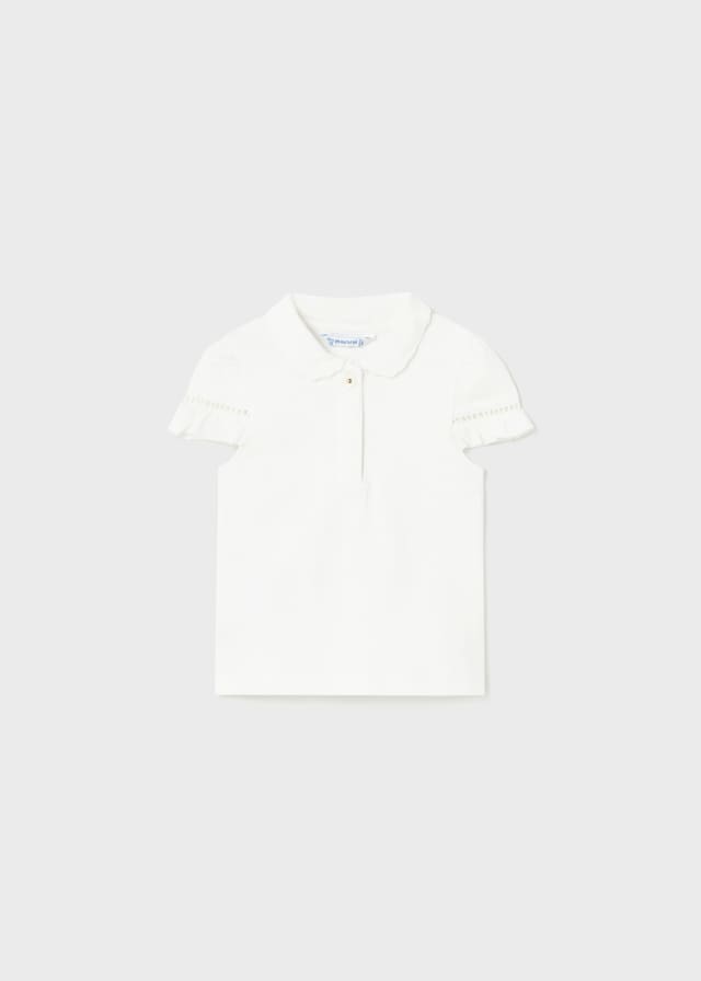Prenda ECOFRIENDS, contiene algodón sostenible. Polo de manga corta para bebé con detalles de volantes. Cuello con ondas.
