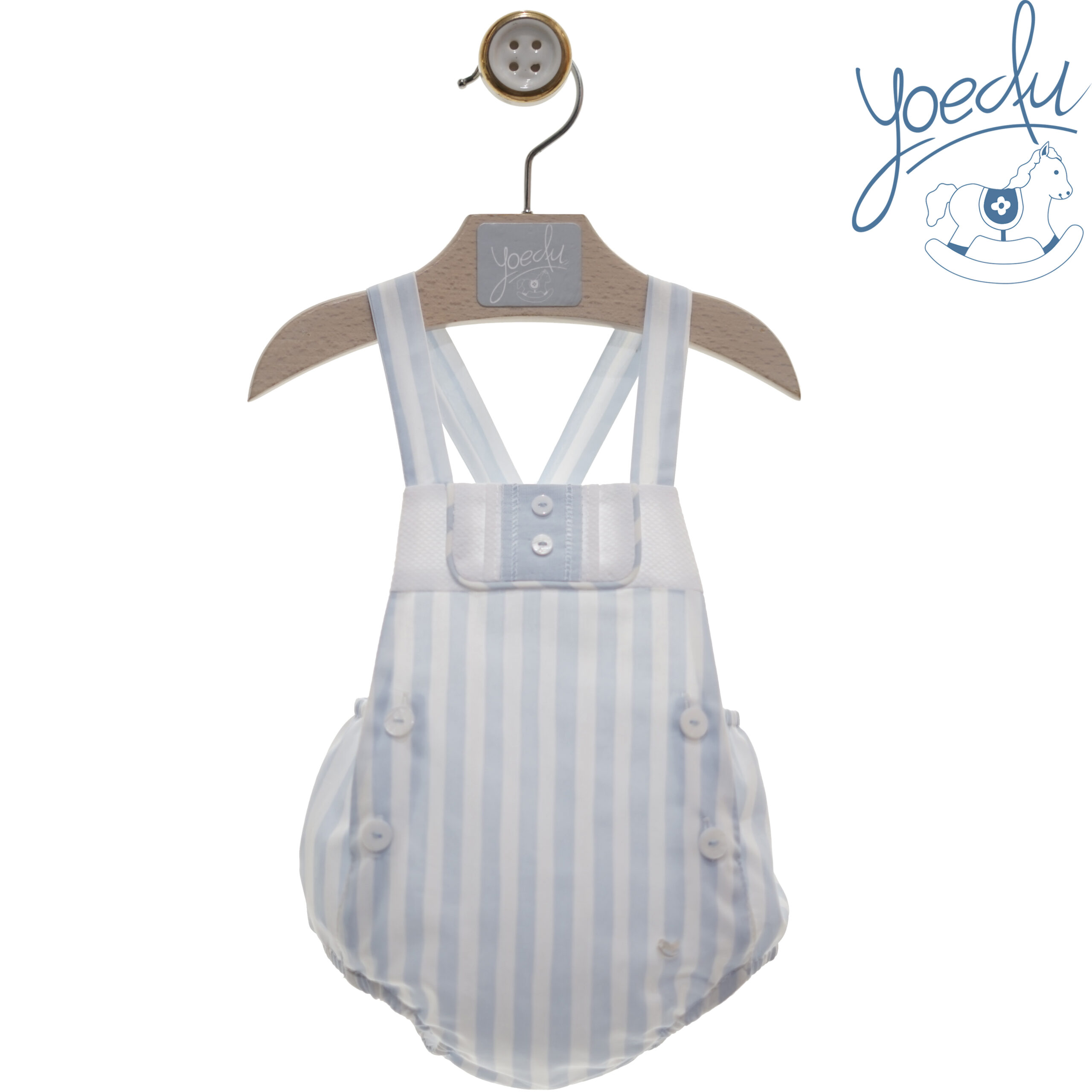Ranita bebé tirantes con rayas celeste y blanco.