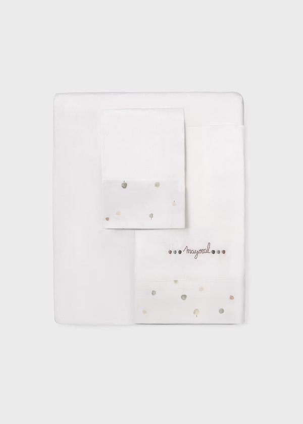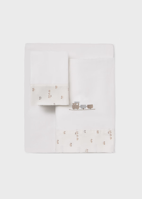 Delicado juego de sábanas para vestir la cuna de tu bebé. Consta de una bajera ajustable con goma elástica, funda para almohada y sábana superior. Tejido 100% algodón.