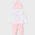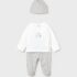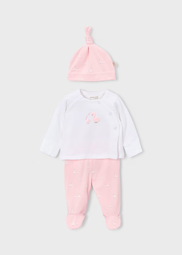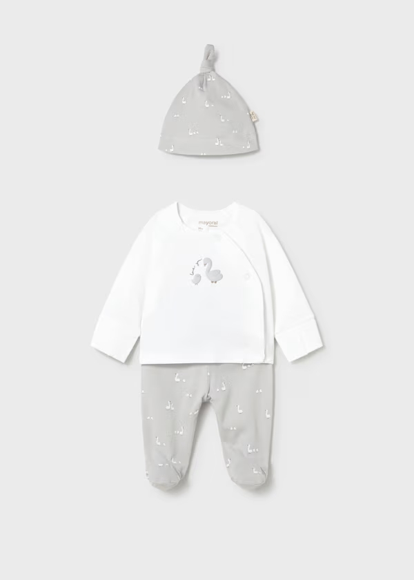 Set regalo de tres piezas para recién nacido. Jersey de manga larga con cuello redondo. Cierre con botones en la espalda para facilitar la puesta. Tejido de punto tricotosa de tacto suave y agradable. Polaina con pies y cintura elástica para un mejor ajuste. Gorro a juego para mayor confort. Elementos de adorno: detalles de canalé. Entre 0-2 meses.
