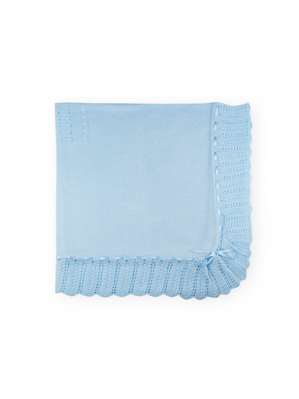 Toquilla calada en color celeste con adorno de pasacintas en raso al tono.