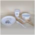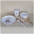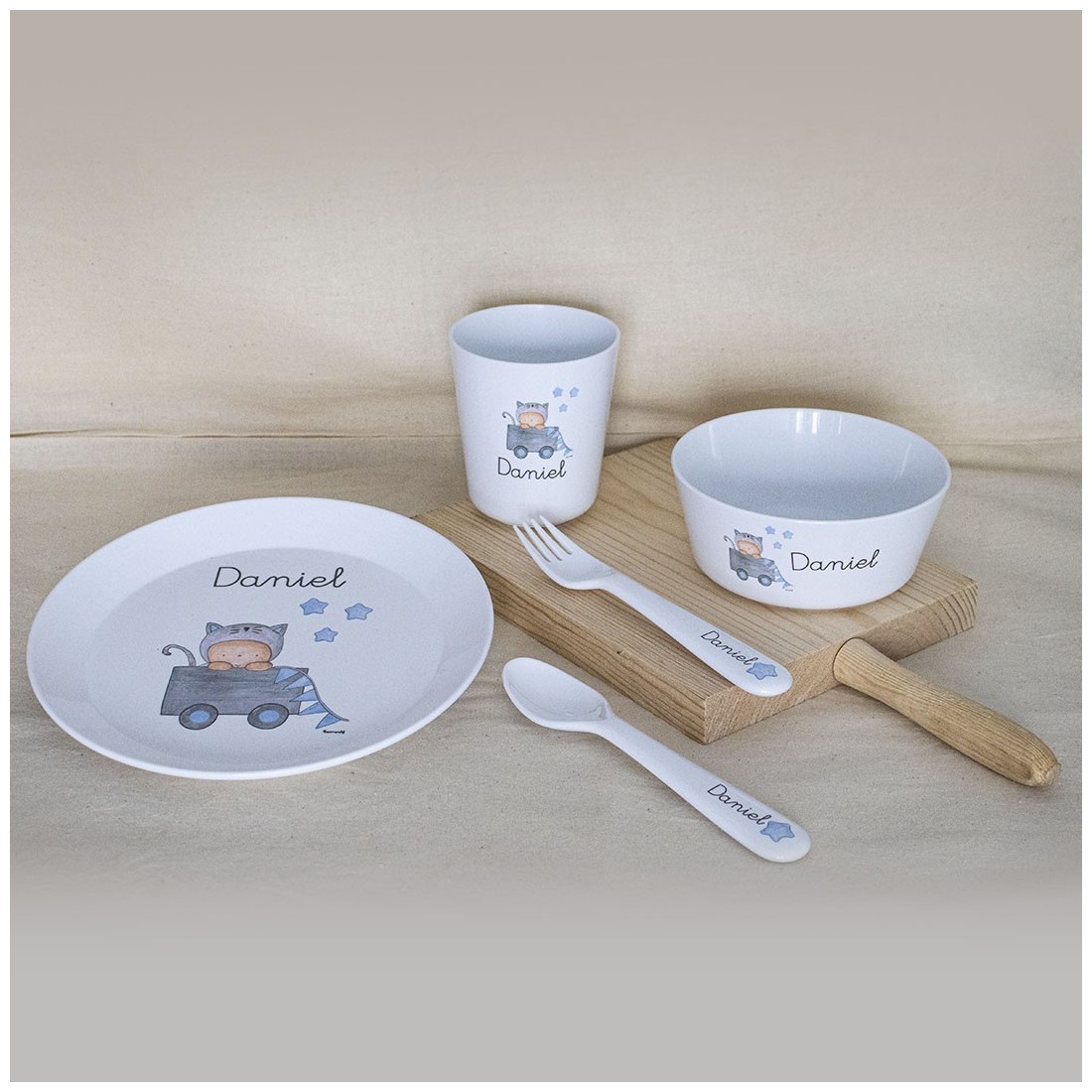 Juego de Vajilla compuesto de Plato, Cuenco, Vaso y Cubiertos con diseño de Juguetero, disponible en colores Rosa o Azul y personalizado con un nombre.