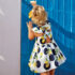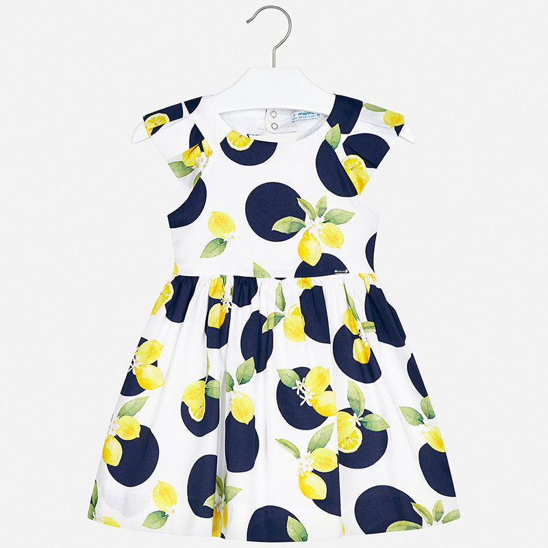 Vestido de manga corta para niña con espalda cruzada. Cuello redondo. Cierre con cremallera invisible en el lateral de la prenda. Mezcla de tejidos combinados para lograr un diseño único y diferente. Modelo con rizo. Diseño estampado.