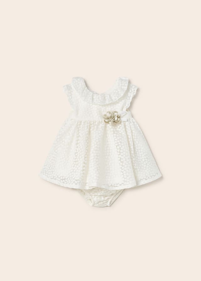 Conjunto de dos piezas para recién nacido formado por un vestido con braguitas a juego. Cierre con cremallera en la parte trasera.